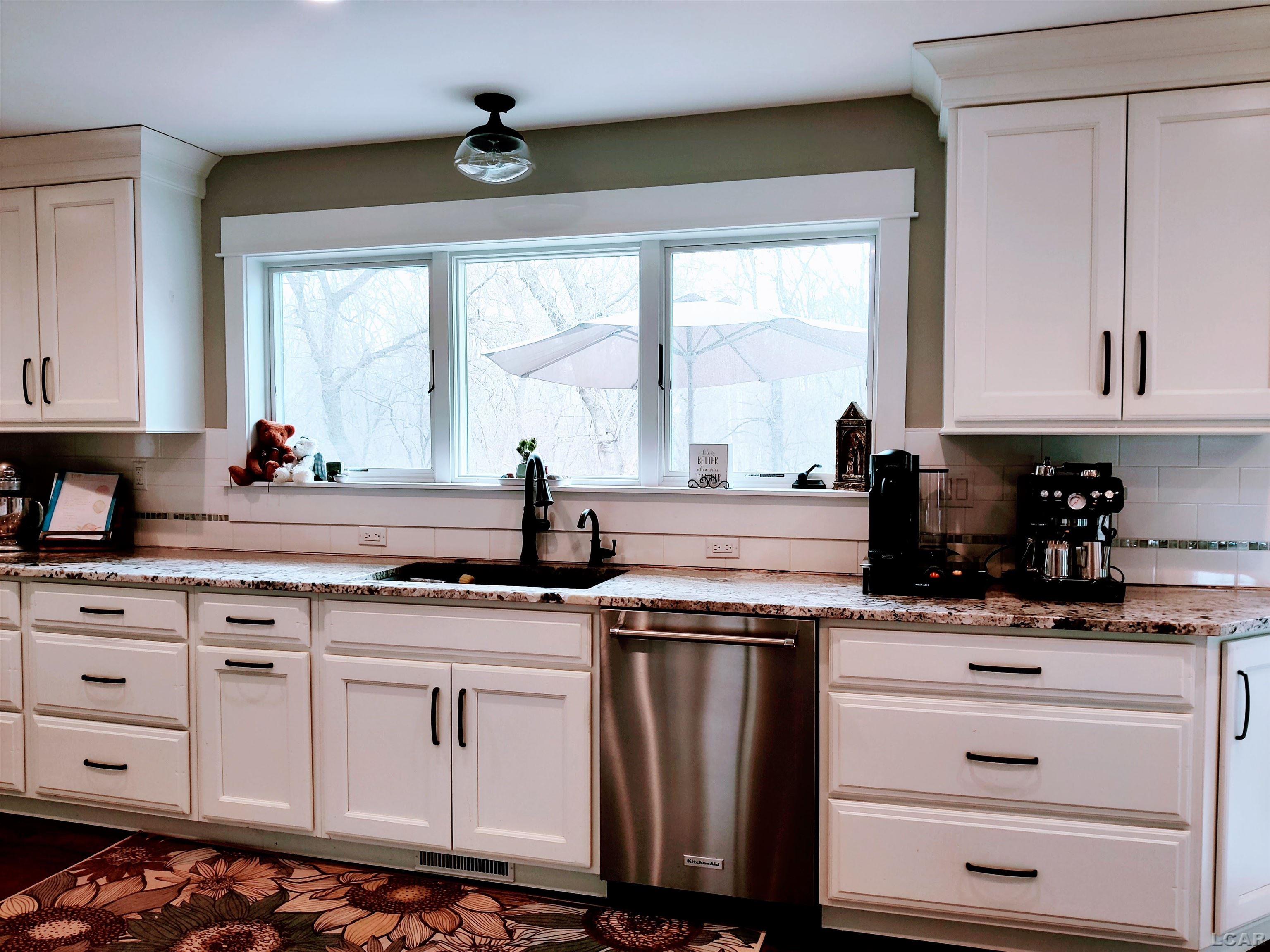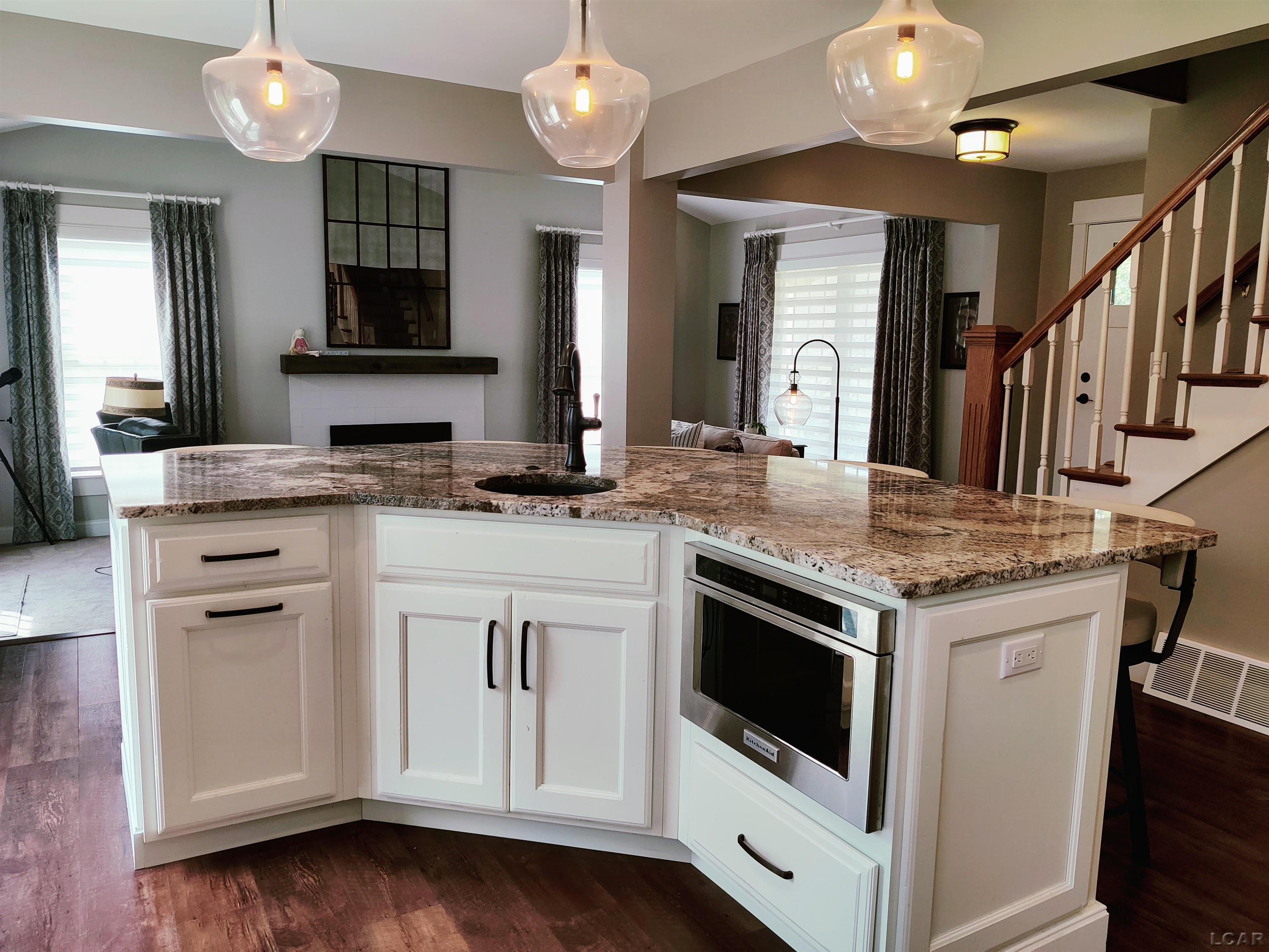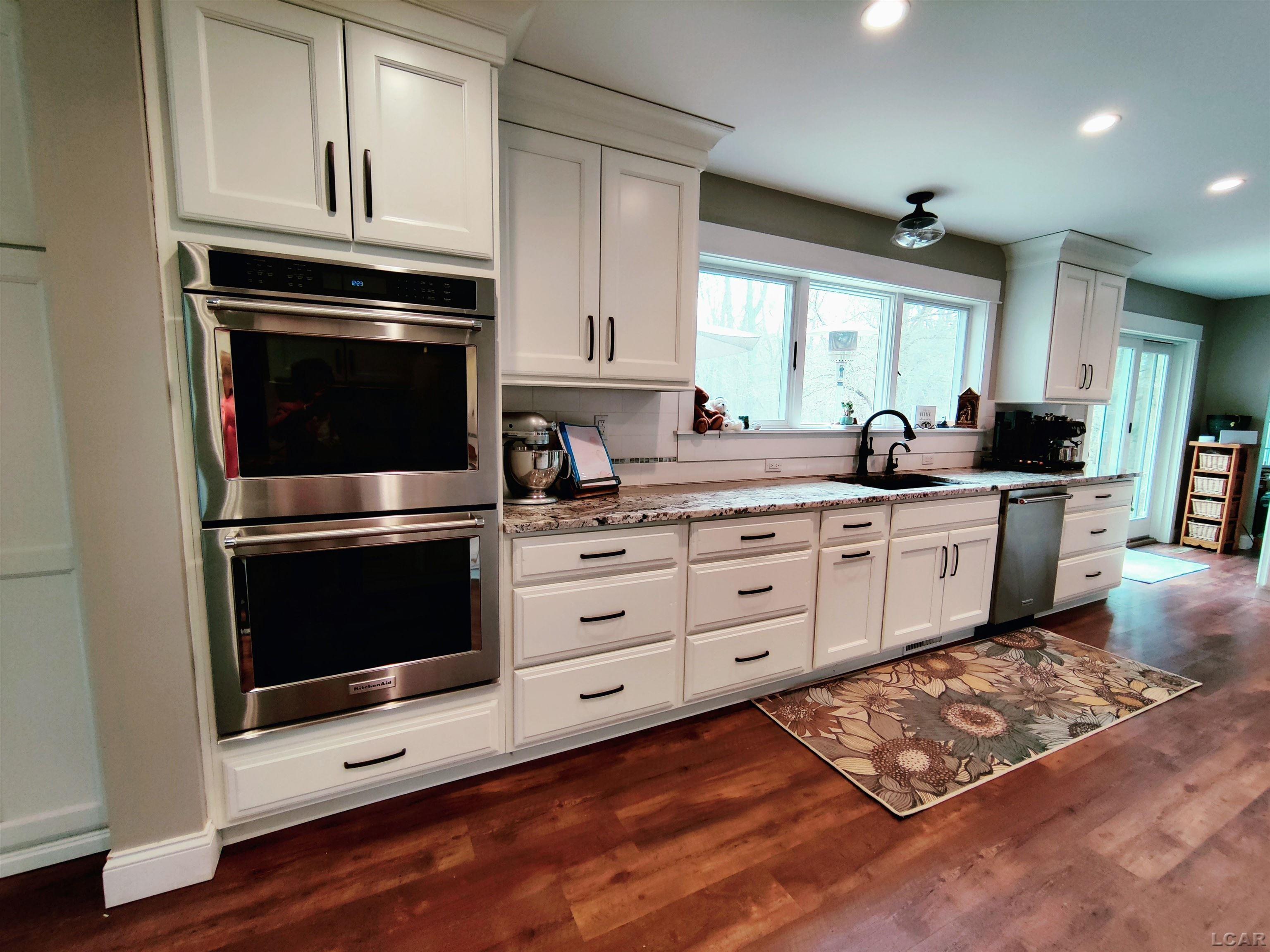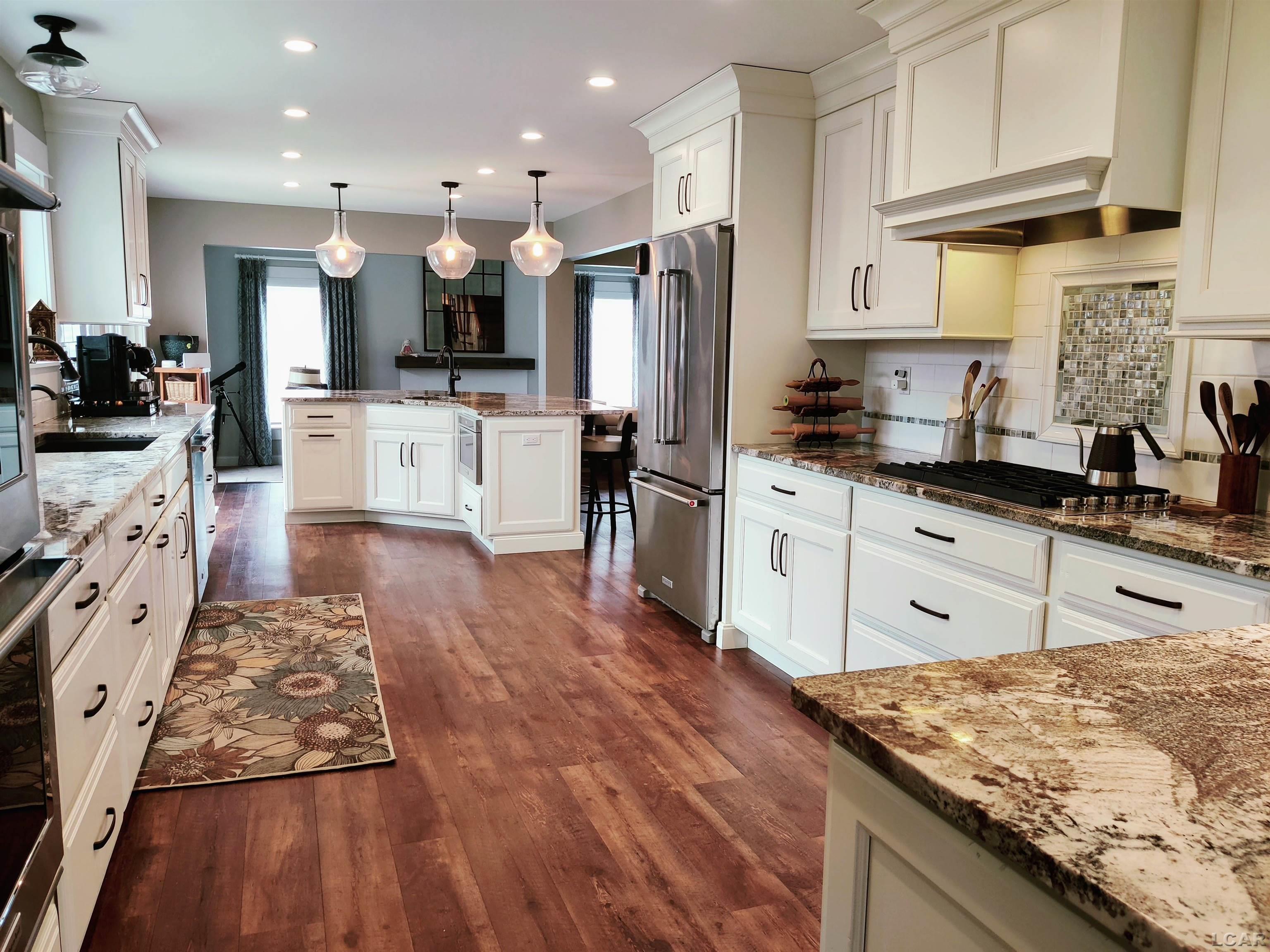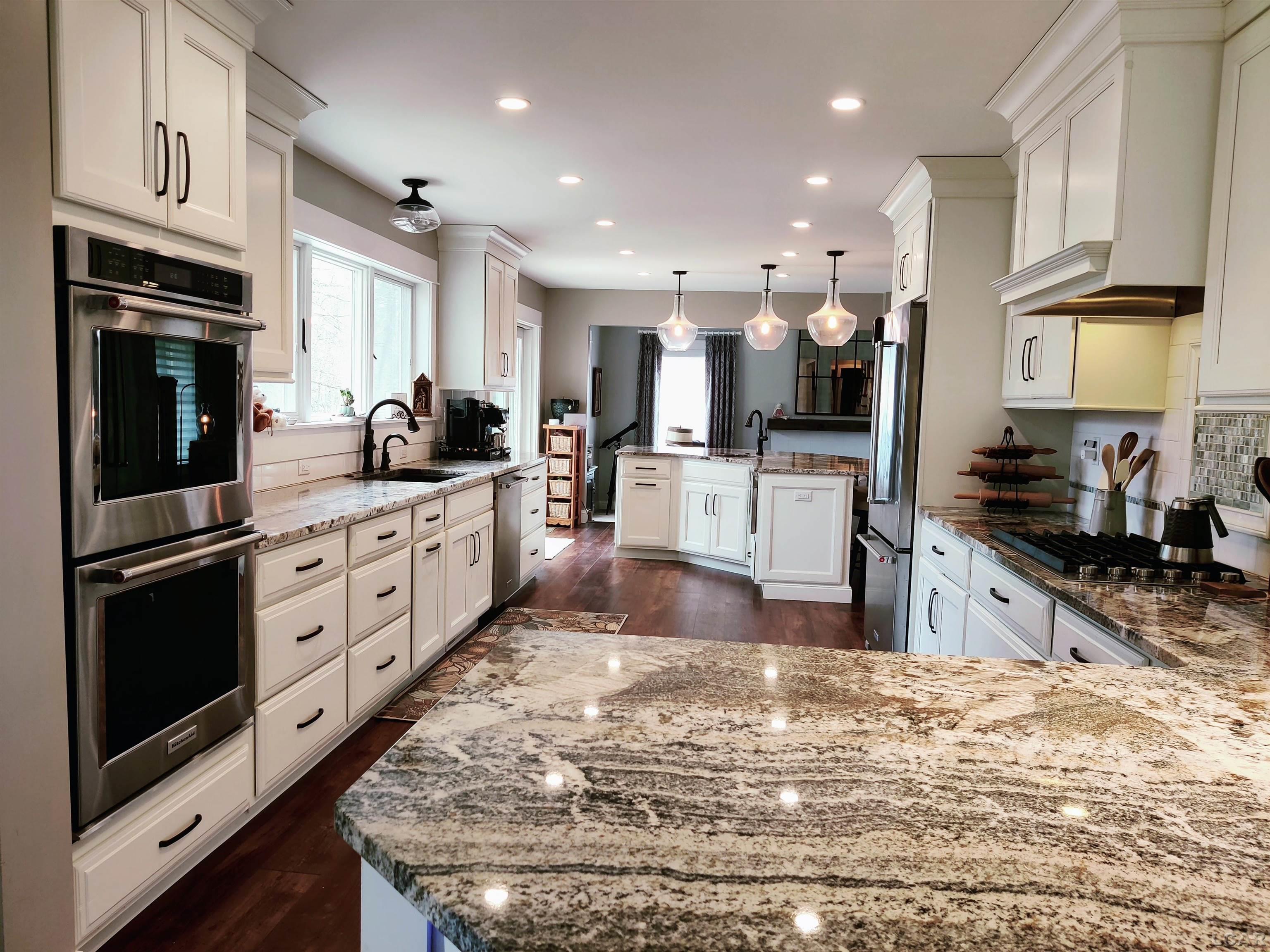 and endless natural light. Enjoy the large kitchen featuring triple windows, dual ovens, granite counters, and island with a built in microwave and prep sink and breakfast bar with