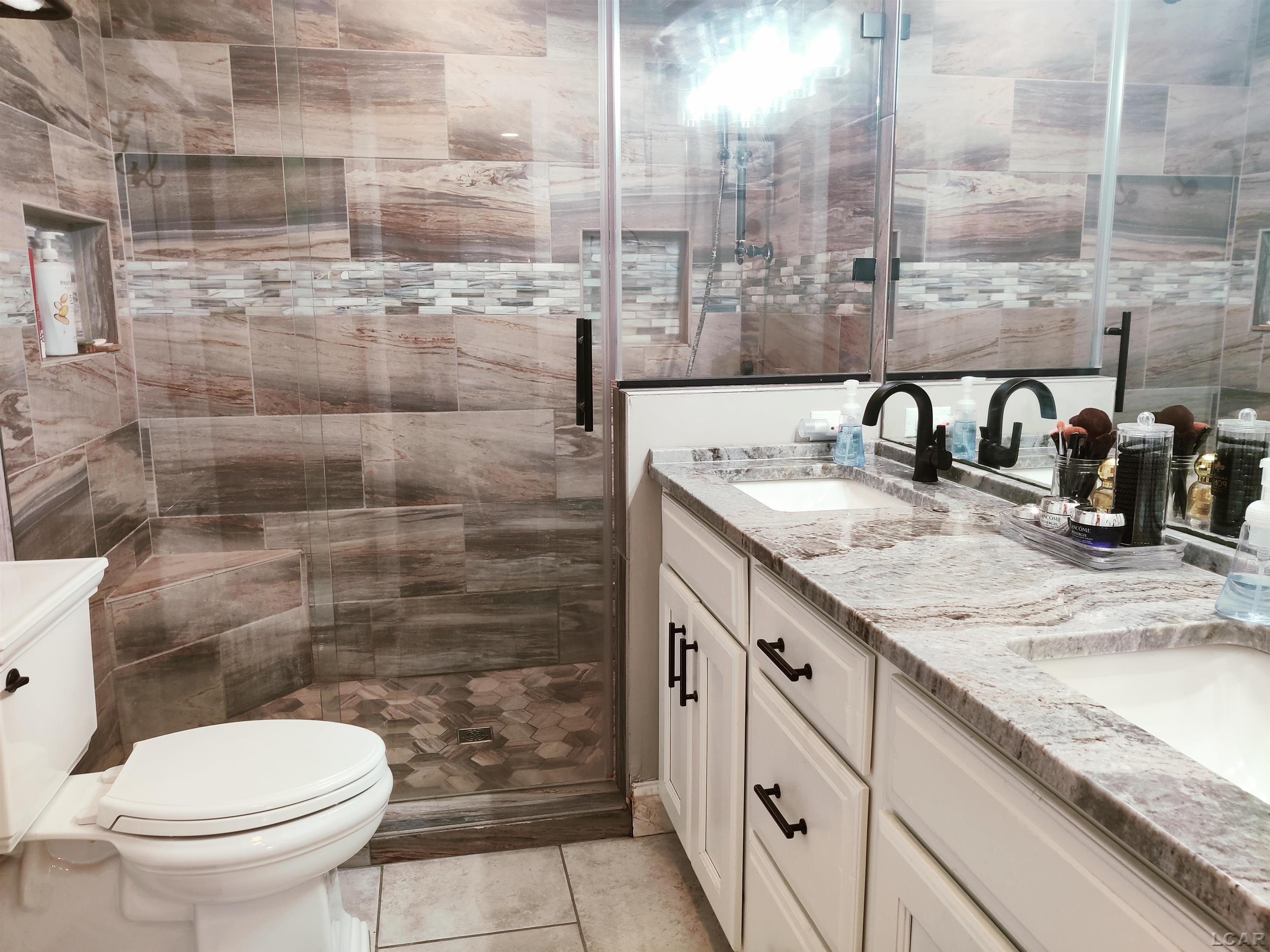 stools and overlooks the livingrm with gas fireplace. Master suite with new bathrm and large walk in shower. The over-sized familyrm has a wet bar. The entry deck is 12 x 12, the