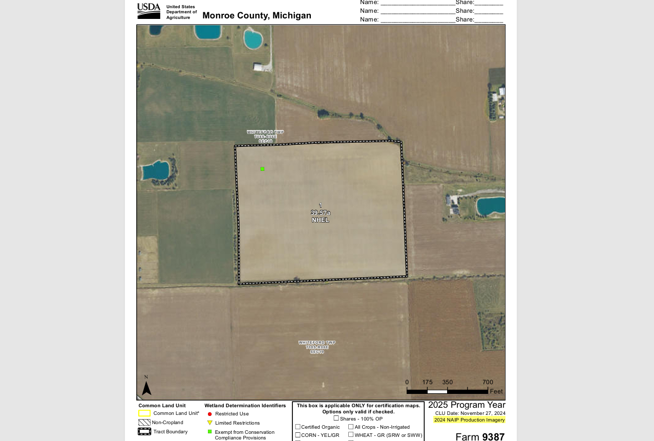 The subject property is currently encumbered by a farm lease agreement effective through December 31, 2025. At closing, Seller shall assign all rights and obligations under said lease, including entitlement to the remaining lease payment, to Purchaser.